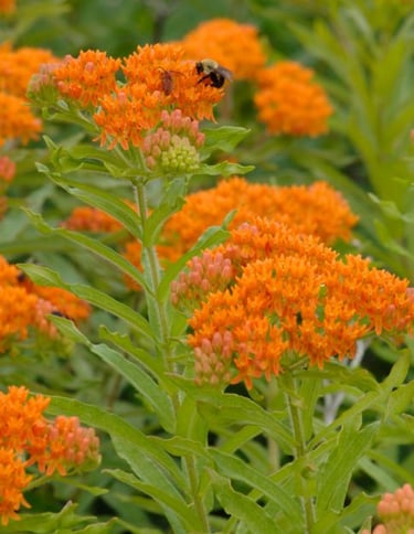 Butterfly Weed, is most often a distinctive bright orange but there is some variation in flower color, from deep red-orange to yellow. This distinctive color and the absence of the typical milky white sap that other Milkweed species have make identification easy. The leaves are somewhat narrow, up to 1” and tapered, with no stem and dark green in color.