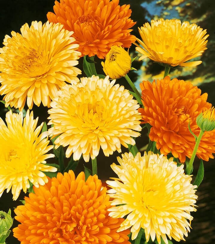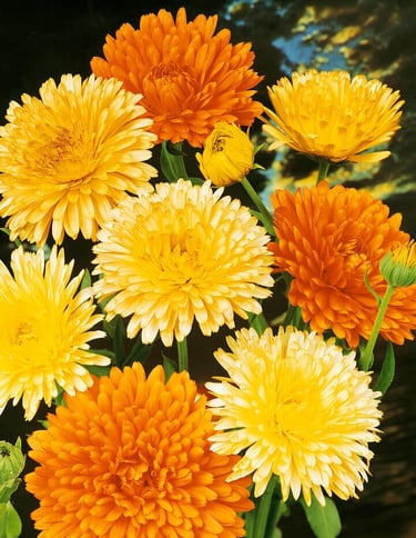 Calendula are actually short-lived tender perennials. In Canada grow as an annual. Blooms vary in size from 2.5 cm to 10 cm in a range of colours, from yellow, to orange, apricot, and cream. Growing conditions affect colour, flower form, size, and bloom longevity.
