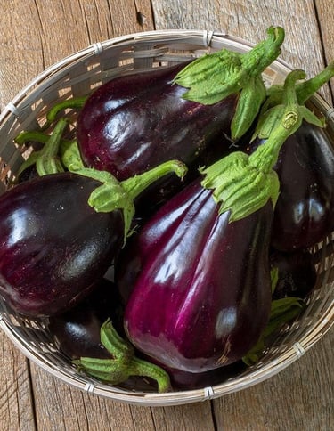 Dark purple to almost black skinned, glossy, oblong, large fruits that form early on sturdy plants. Grown for over 100 years, this heirloom is a heavy producer with up to 12 fruits per plant, but needs lots of heat.