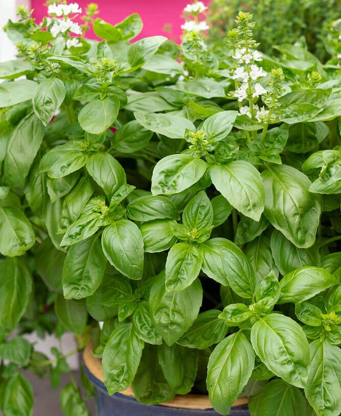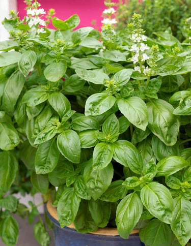 Vigorous plants that grow big, mid-green leaves all summer long. Keep picking the growing tips and the 2 pairs of leaves below them for the kitchen. More branches sprout more leaves. Sweet basil is a large-leaved Italian type that is glorious for pesto.
