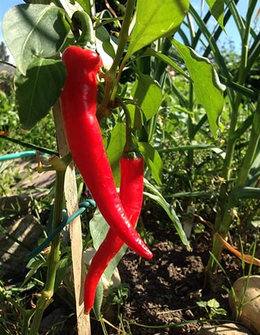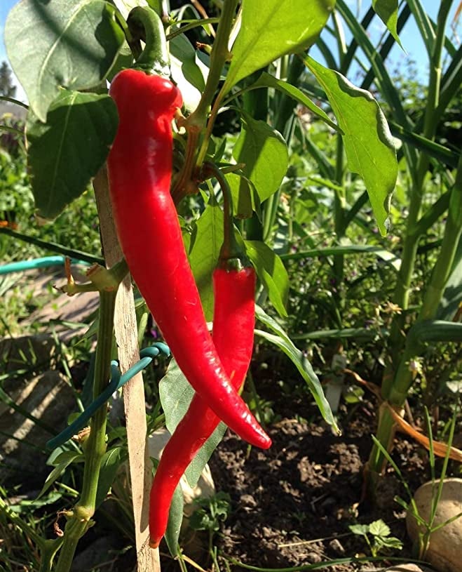 Long Red Cayenne is moderately hot. Plants about 75 cm tall produce thin, tapered, hot peppers about 12.5 cm long and 1.25 cm thick. The fruit is often curled and twisted and ripens to a green/crimson red. Ideal for canning, pickling or drying! A very good all purpose hot chili.