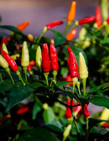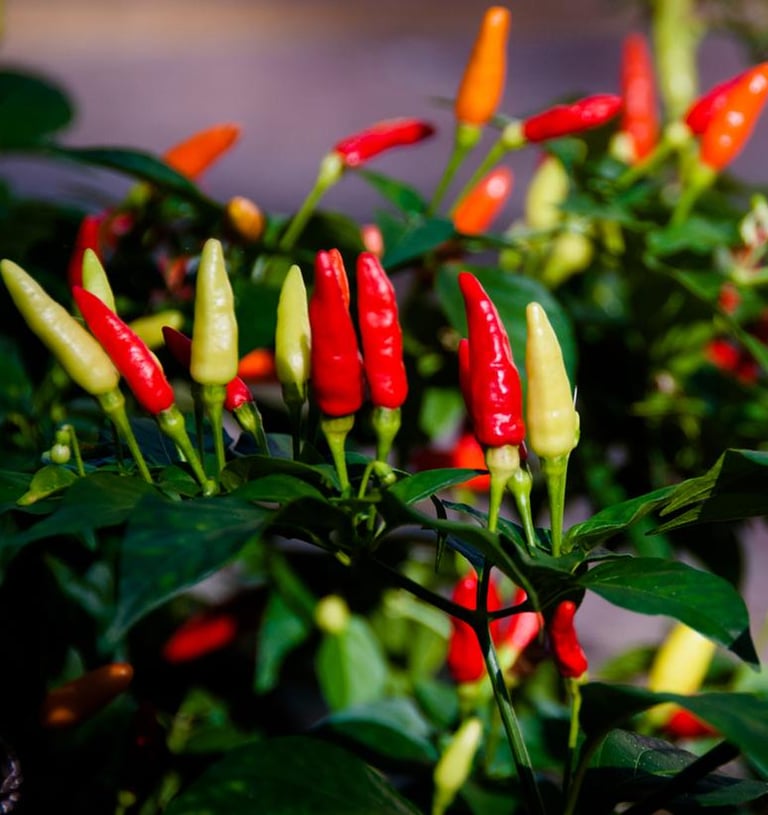 Immature peppers are either dark purple or light yellow and mature to purple-streaked red or orange. A fun and surprising array of colours.