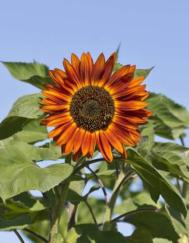 Rich copper red petals are highlighted with golden yellow around a nearly black central disc. Plant Velvet Queen sunflower seeds for 1.5m (5') tall plants with simply gorgeous blooms around 13cm (5") wide. This variety looks its best when contrasted with some bright yellow sunflowers in a border or raised bed.