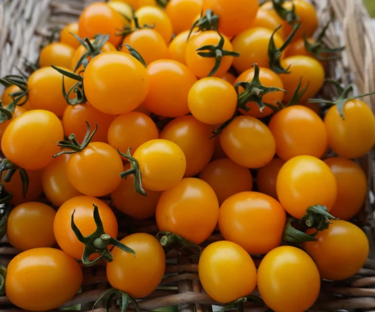 Indeterminate yellow cherry tomato that is easy to grow and early to mature. Sweet Gold produces heavy yields of small, 10-15g (.35-.5oz) fruit growing in single and double clusters. For optimal flavour, harvest when fruit is bright yellow. A good choice for gardens with a relatively short growing season.
